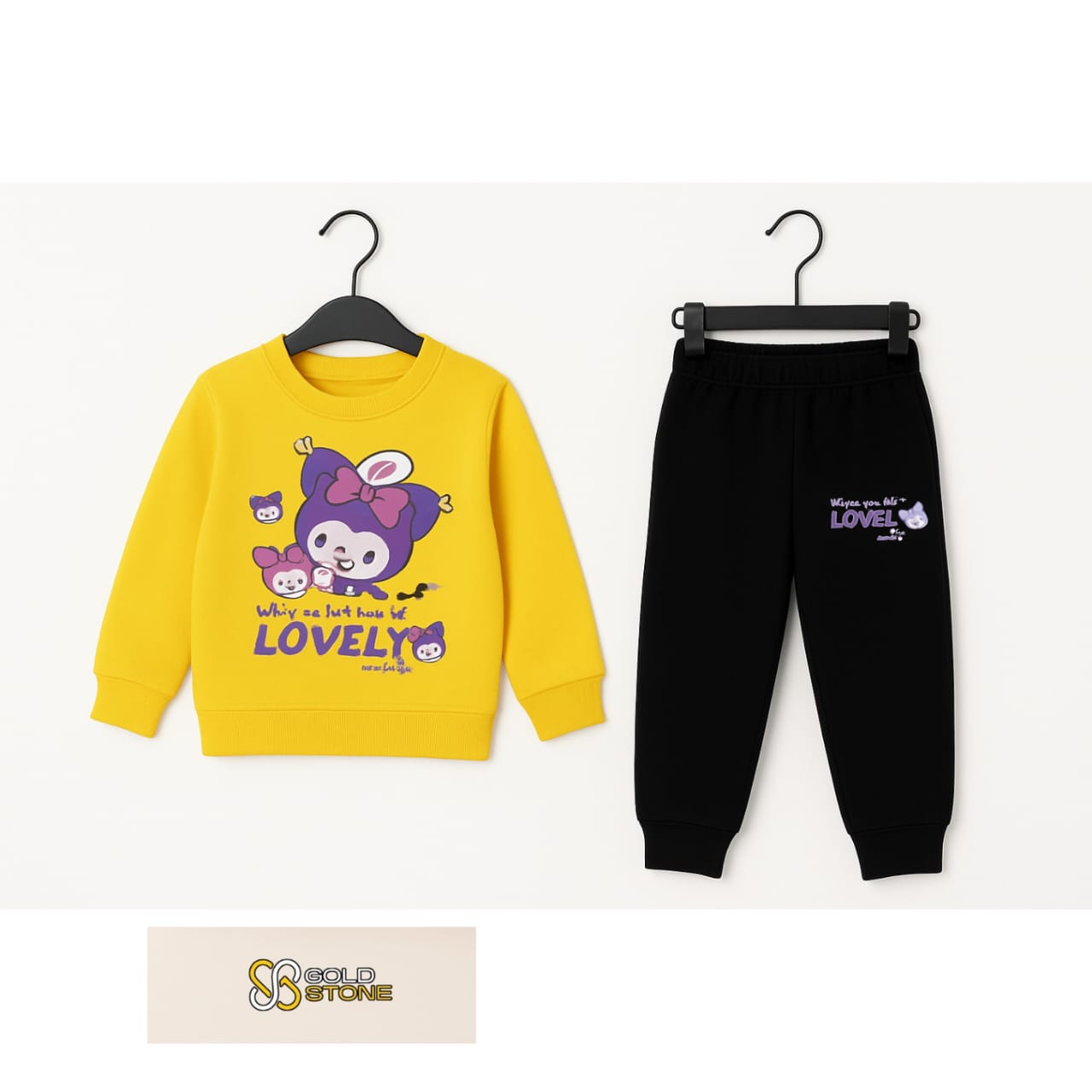 This Yellow & Black fleece tracksuit features a fun character-inspired print on the sweatshirt paired with matching jogger pants. Made from soft, warm fleece, it keeps kids cozy on chilly winter days while giving them easy movement for playtime, school, or outings